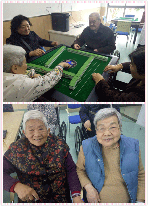 这次令小朗惊喜的是住在五区的一对老夫妻和往常的状态完全不同,他们刚入住时大多数时间都是在房间里,董阿公默默的看报纸、看电视,蒋阿婆则在房间做着理疗。而今天阿公居然坐在活动室里欢快的磋着麻将,阿婆在和自己新认识的好朋友愉快的聊天呢。