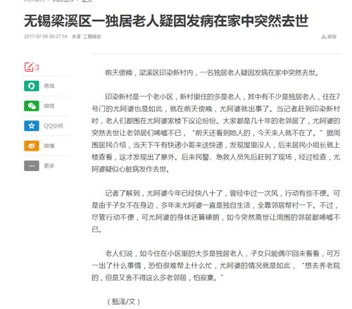 ![]() 这是一条令人非常痛心的新闻!子女工作繁忙不能经常陪伴老人,导致小区里的独居老人越来越多,这是大多数家庭都会遇到的情况。有些子女为老人选择了合适的养老机构,但不少老人就和新闻里的尤阿婆一样不愿意离开,舍不得老邻居,怕寂寞。