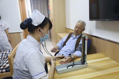 护士为老人准确测量血糖、血压等,并将每位老人早上的生命体征反应给医生,为他们提供信息。