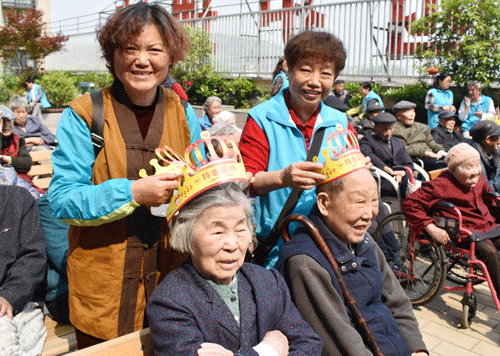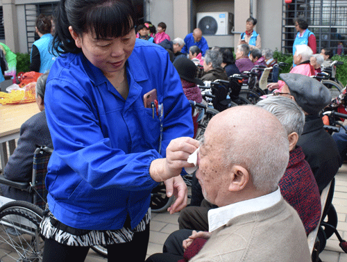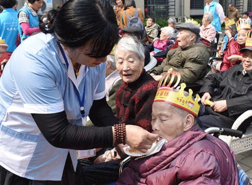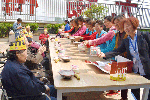 生日帽、蛋糕、长寿面,是朗高生日会必不可少的三要素,老人们在义工和医护人员的陪同下,度过了一个愉快而温情的生日会。