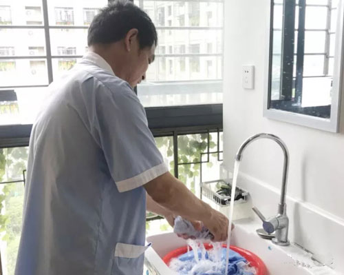 ![]() 酷暑难耐,朗高护理人员顶着高温洗衣服,早已汗流浃背。