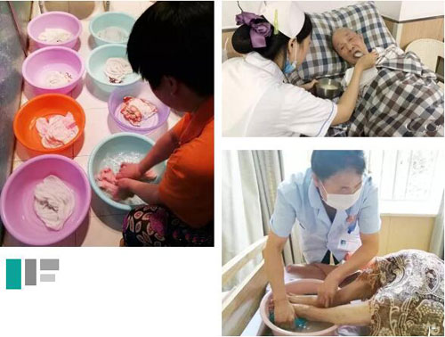 ![]() 各楼层房间,护理员们已经开始了一天的忙碌,他们五点左右就起床,急忙端着一盆又一盆的热水为老人擦身、处理大小便、整理床铺……一直忙到给老人喂饭时,她们都来不及喝口水、擦擦汗。