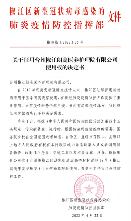 进入2022年以来,新冠疫情在全国各地频发,严重影响人民的正常生活工作。在当前国内新冠疫情反复、防控形势复杂的情形下,近期经台州市椒江区新型冠状病毒感染的肺炎疫情防控指挥部来函,决定征用台州椒江朗高康复护理院供医学隔离观察使用。——“急难有情,情有余兮”,关键时刻,越秀朗高履行大爱使命;紧要关头,彰显国企担当。