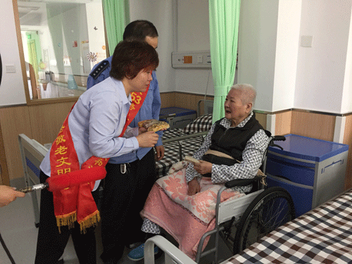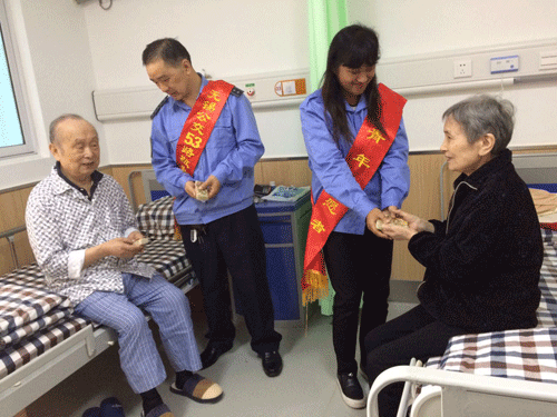 ![]() ![]() ▲志愿者来病房看望老人给老人送上重阳糕